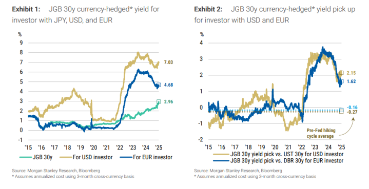 自4月初以来,30年期日债收益率已经飙升了85个基点,同期30年期美债收益率上升了60个基点。尽管货币对冲后的日债收益率对外国投资者看似极具吸引力,但摩根士丹利最新分析警告投资者,这可能是一个正在形成的“价值陷阱”。